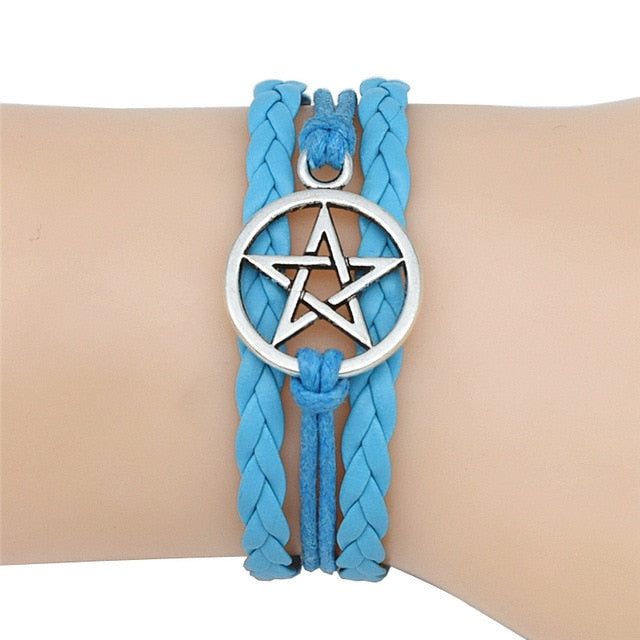 Pentagram Wiccan Pentacle Leather BraceletChain Type: Rope ChainClasp Type: Lobster-claw-claspsMetals Type: Zinc AlloyLength: About 16cm + 5cm extended chain (adjustable)