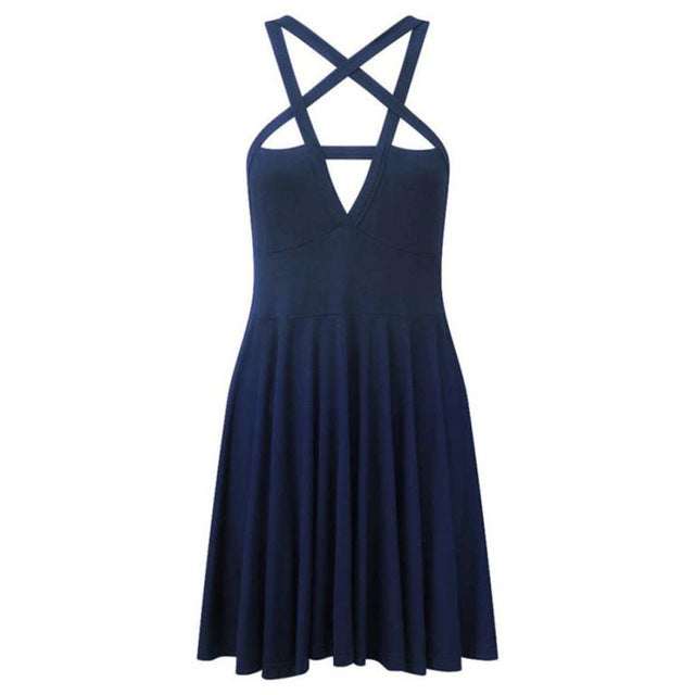 Sexy Pentacle Mini Dress Silhouette: A-LineDresses Length: Above Knee, MiniSleeve Length(cm): SleevelessMaterial: Chiffon,Polyester,Cotton